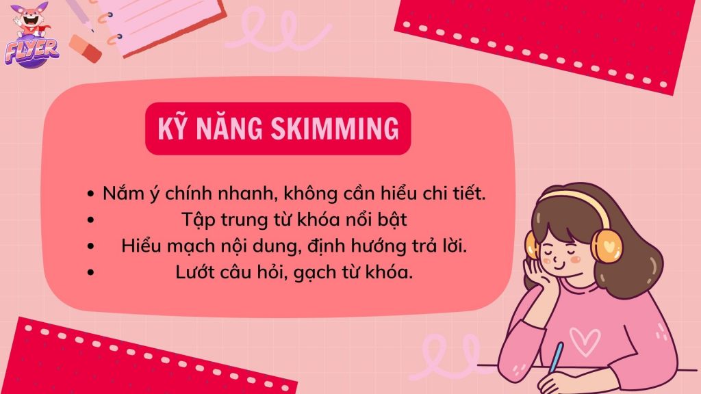 Kỹ năng Skimming cho phép bạn nắm bắt ý chính của đoạn nghe và đề bài trong thời gian đọc đề. Mục đích của Skimming là giúp bạn có định hướng rõ ràng hơn để trả lời câu hỏi trong khi nghe mà không cần hiểu toàn bộ chi tiết của bài nghe.