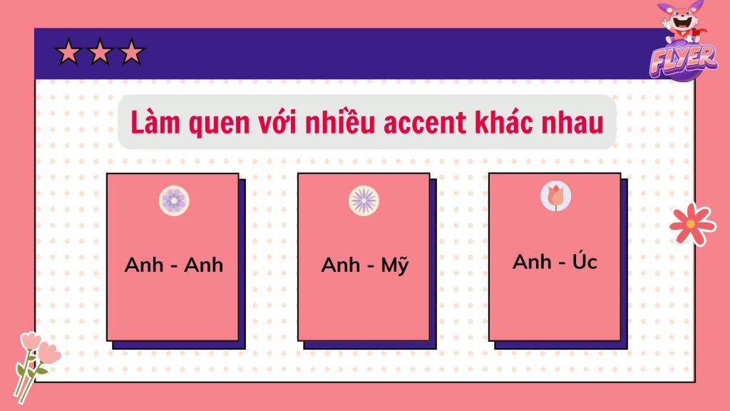 Trong bài thi IELTS Listening, bạn có thể bắt gặp nhiều accents (giọng) tiếng Anh khác nhau, phổ biến nhất là Anh-Anh, Anh-Mỹ và Anh-Úc.
