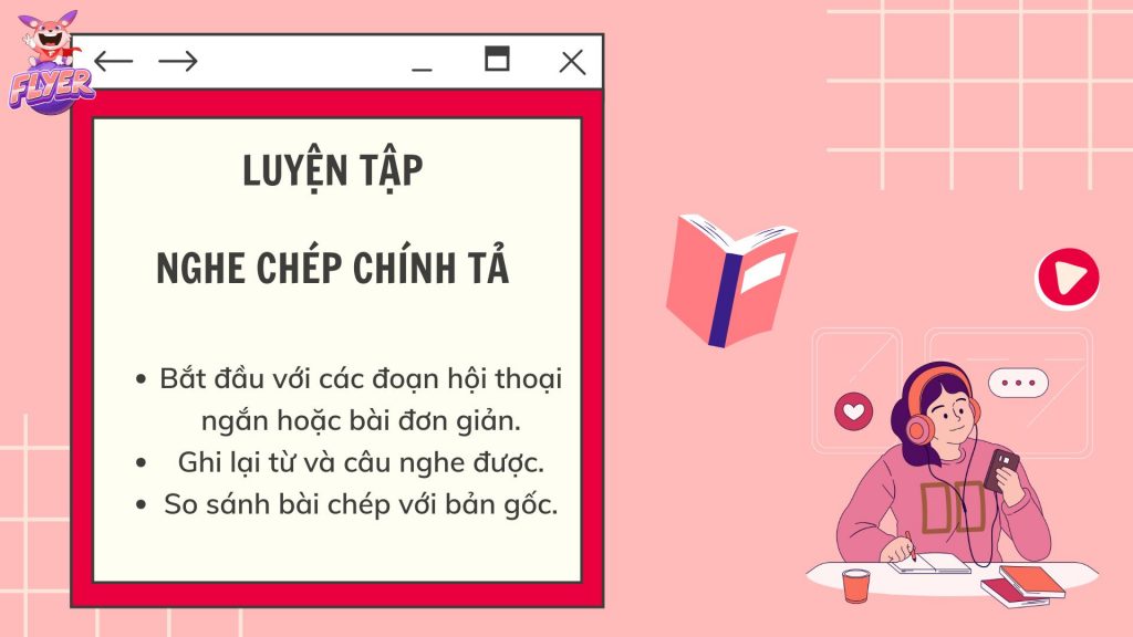 Bạn có thể bắt đầu với các đoạn hội thoại ngắn hoặc những bài nghe đơn giản dựa theo sở thích cá nhân, tập trung ghi lại từng từ và câu nghe được trong đó. Sau khi hoàn thành, bạn hãy so sánh bài chép của mình với bản gốc để phát hiện lỗi sai và điều chỉnh.