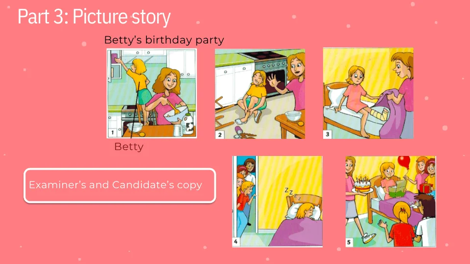 Trong phần 3, thí sinh được yêu cầu kể một câu chuyện đơn giản dựa trên hình ảnh cho sẵn. Tuy nhiên, điều này không đòi hỏi kỹ năng kể chuyện ở mức độ cao. Thí sinh chỉ cần nói một vài từ về mỗi bức tranh mà không nhất thiết phải đưa ra những bình luận thành một bài tường thuật.