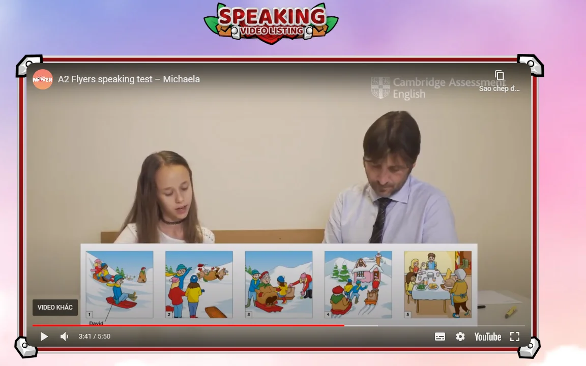 Phụ huynh có thể tham khảo video dưới đây từ Cambridge, mô phỏng thực tế một buổi thi Speaking trình độ A2 Flyers:
