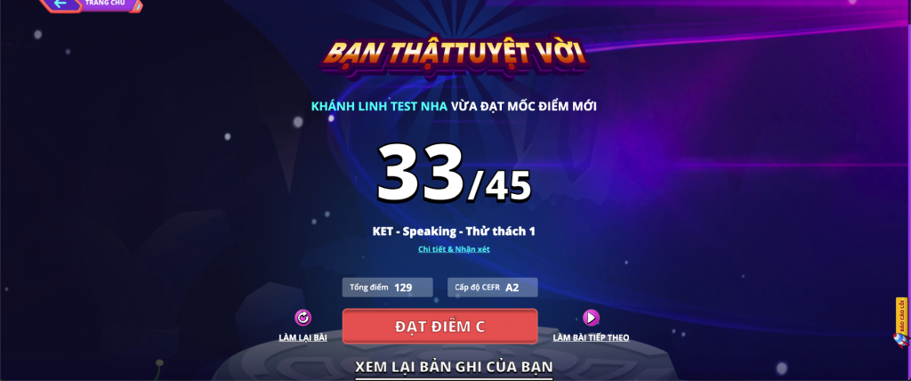 Tại trang chủ, ba mẹ chọn Speaking bên trái màn hình, cấp độ KET PET sẽ hiển thị tại đây. Con bấm và chọn đề thi bất kỳ để bắt đầu ôn luyện nhé.