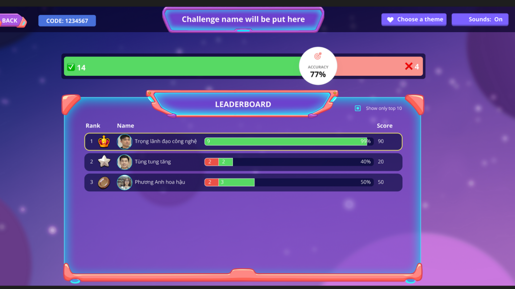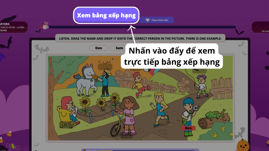 Để theo dõi trực tiếp kết quả, khi vào phần bài thi, con sẽ thấy mục “Xem bảng xếp hạng” ở góc trên bài thi. Nhấn vào đó, một bảng xếp hạng thách đấu được hiển thị bao gồm: