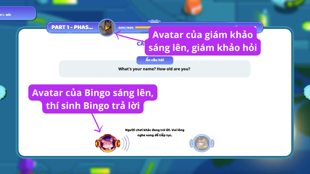 Với mong muốn giúp học sinh làm quen với đề thi thực tế, cấu trúc đề thi của FLYER được mô phỏng giống 90% đề thi thật. Trong phần thi KET, PET, FLYER mô phỏng dạng bài Hỏi đáp (Giám khảo hỏi, Bingo và thí sinh lần lượt trả lời). Trong giao diện làm bài, nếu avatar của ai sáng thì sẽ là lượt người đó trả lời.