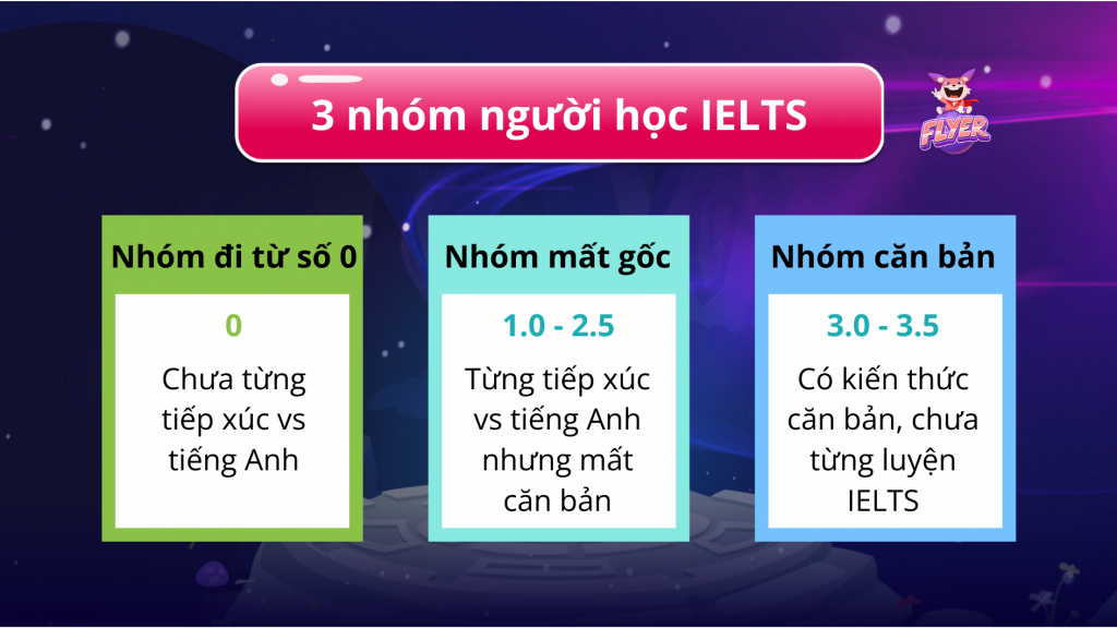 | Nhóm căn bản | Có kiến thức nền tảng, kỹ năng ở mức cơ bản và chưa từng luyện IELTS (band 3.0 – 3.5). |
