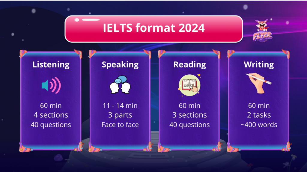 Bài thi IELTS đánh giá 4 kỹ năng sử dụng tiếng Anh tương đương với 4 phần thi Nghe – Nói – Đọc – Viết. Tổng thời lượng thi là 2 tiếng 45 phút đến 3 tiếng.