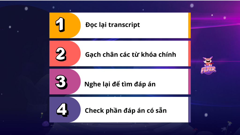 Để luyện tập các bài nghe hiệu quả, bạn đừng check đáp án ngay sau khi hoàn thành bài tập mà nên làm các bước sau: