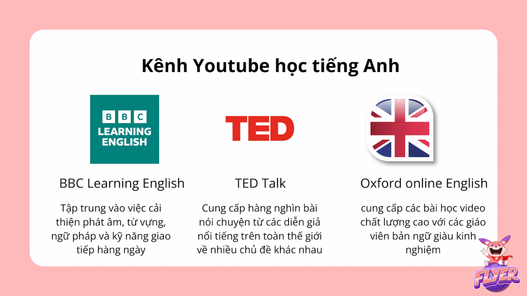 Bên cạnh đó, học Speaking tiếng Anh thông qua các kênh YouTube nổi tiếng như TED Talk, BBC Learning English, và Oxford Online English là một phương pháp hiệu quả và thú vị để cải thiện kỹ năng ngôn ngữ của bạn.