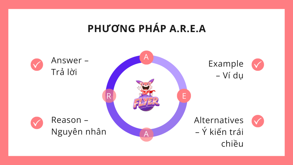 Bên cạnh đó, khi brainstorm (suy nghĩ) ý tưởng, bạn có thể áp dụng phương pháp A.R.E.A trong ảnh trên để trả lời câu hỏi. Đặc biệt trong Part 3 của Speaking IELTS, giám khảo sẽ đánh giá khả năng trả lời những vấn đề trừu tượng và học thuật của bạn. Để trả lời một cách mượt mà và đạt điểm cao, đừng ngại áp dụng ngay công thức siêu hiệu quả này nhé.