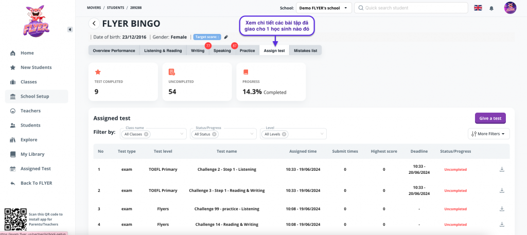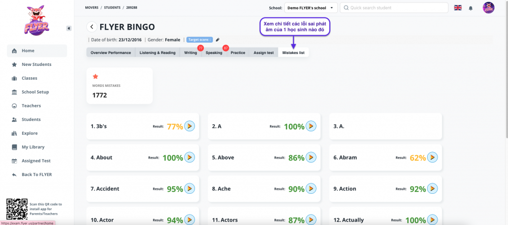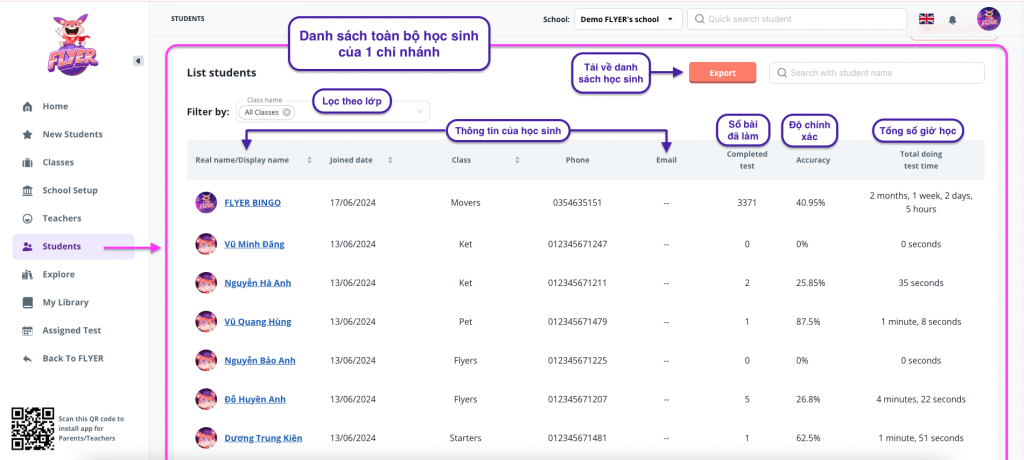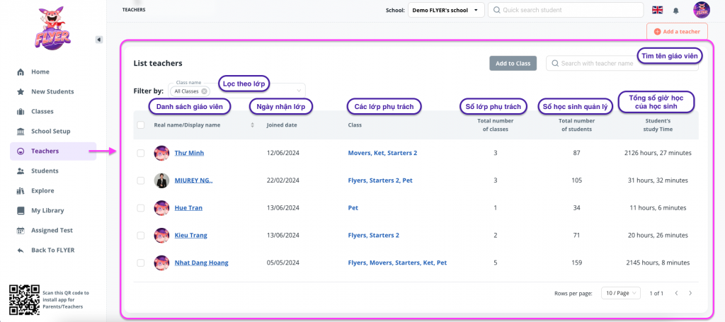Với nhu cầu quản trị trên 30 học sinh, quý thầy cô vui lòng liên hệ FLYER để mua gói FLYER SCHOOL thiết kế chuyên sâu cho các hệ thống, trung tâm và cho trường học.