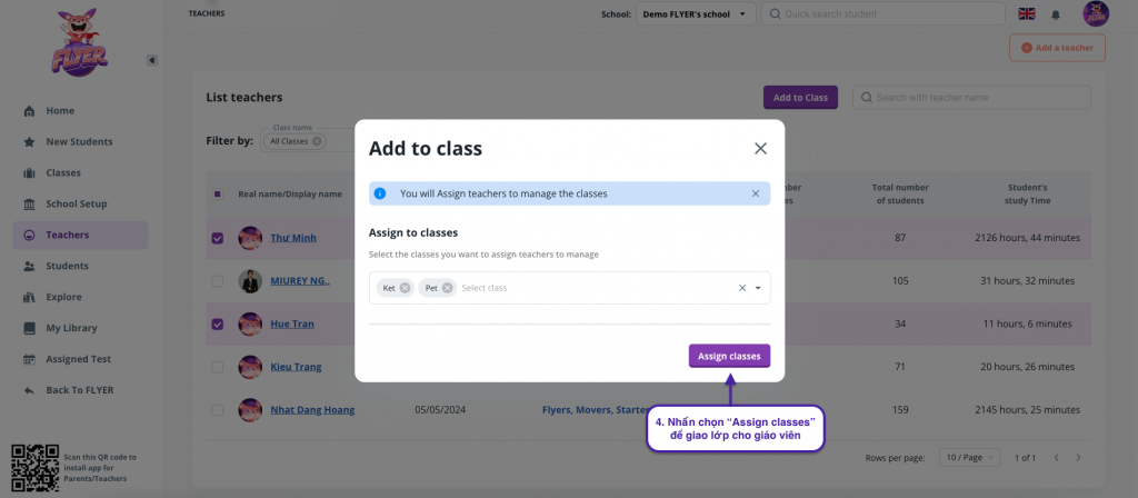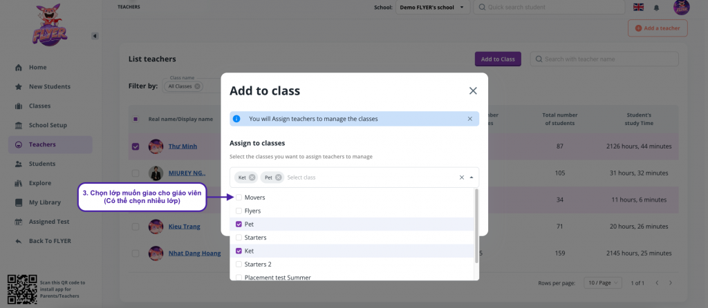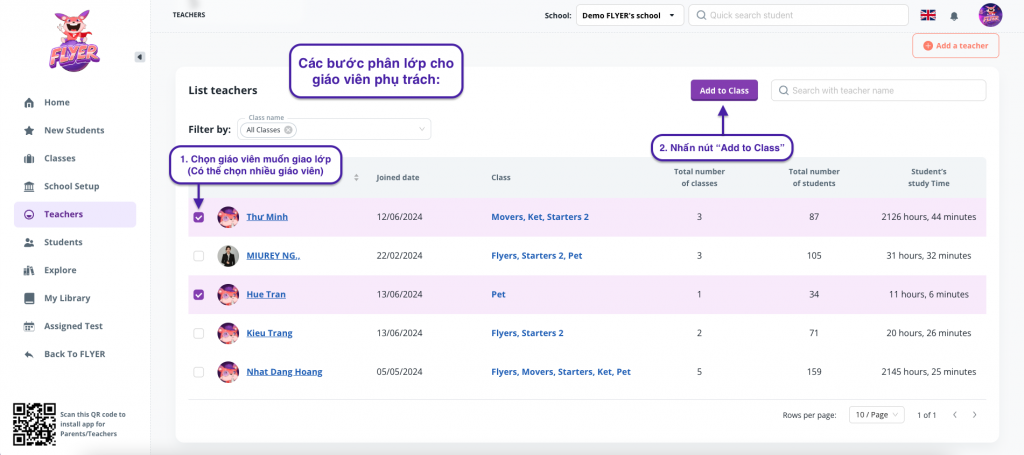 Quản trị viên cũng có thể phân lớp cho giáo viên phụ trách trên FLYER ngay tại trang này theo hướng dẫn dưới đây: