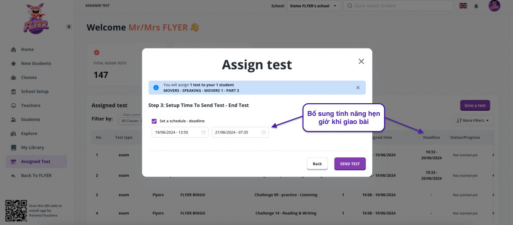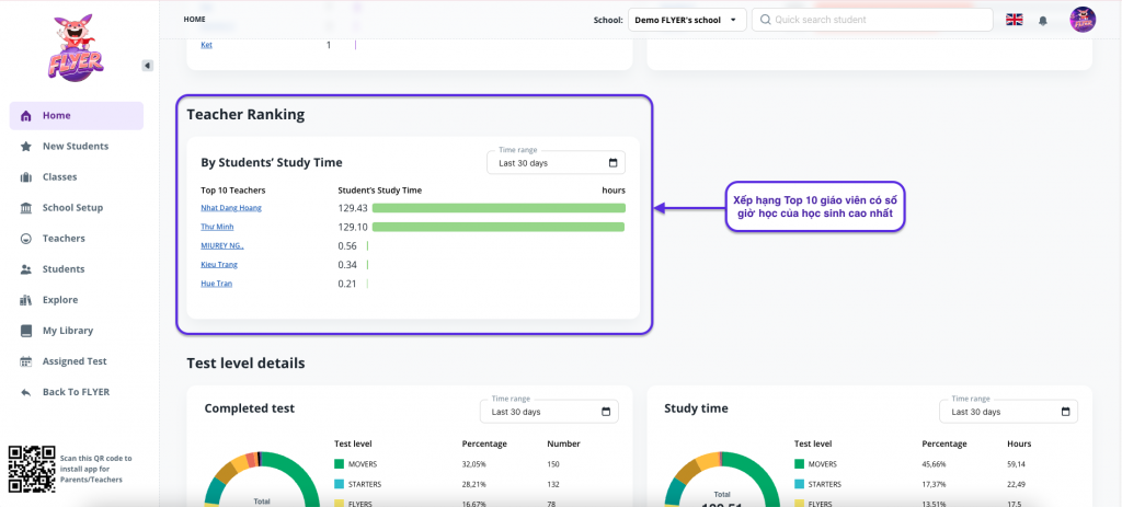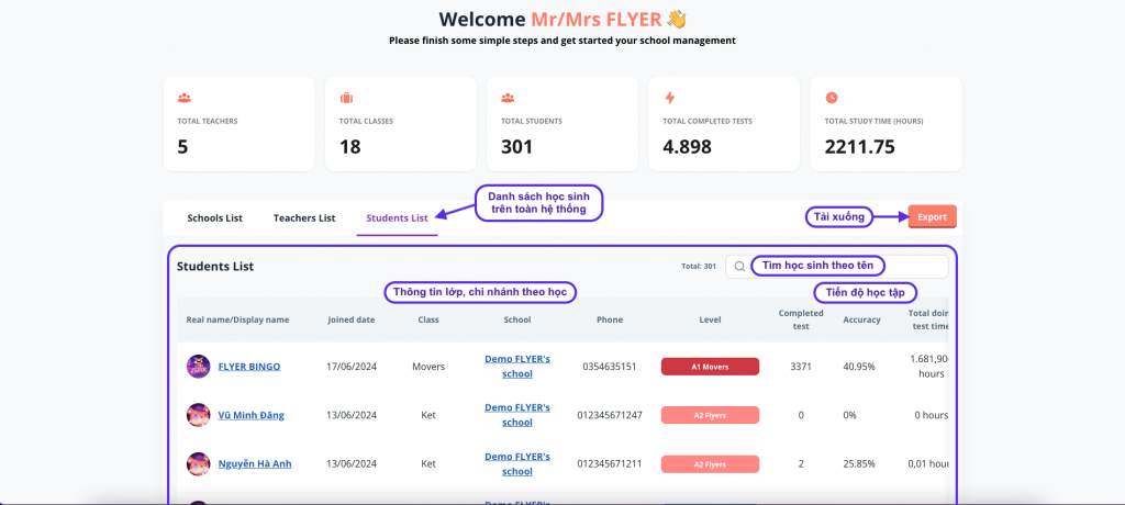 Với tiêu chí luôn gia tăng giá trị cho học sinh và quý thầy cô, cũng như đối tác đồng hành cùng FLYER, Đội ngũ xây dựng sản phẩm đem đến cho quý thầy cô và đối tác bản mới nhất của tính năng Quản trị với nhiều cập nhật giúp cho việc quản lý học sinh và giảng dạy tiếng Anh trở nên tối ưu hơn bao giờ hết.