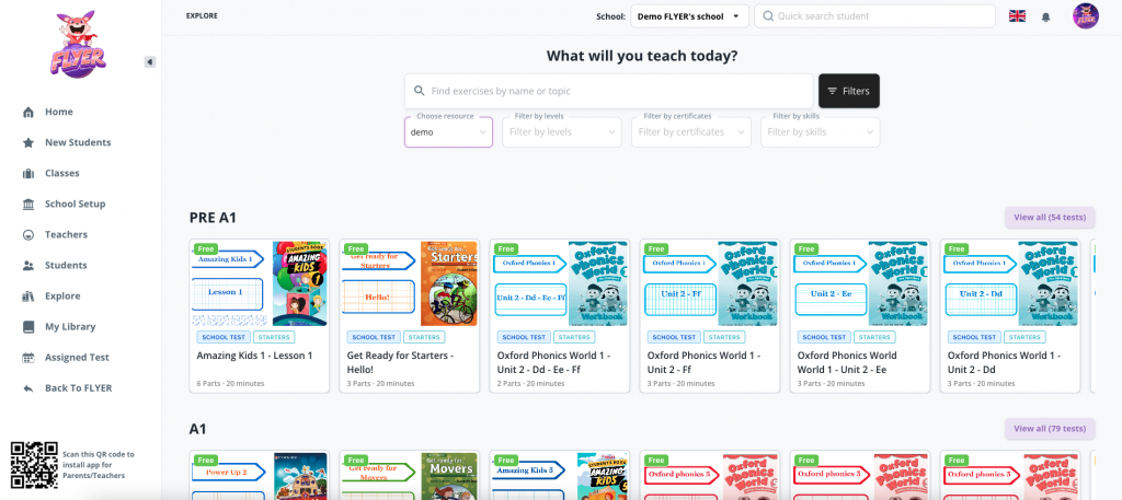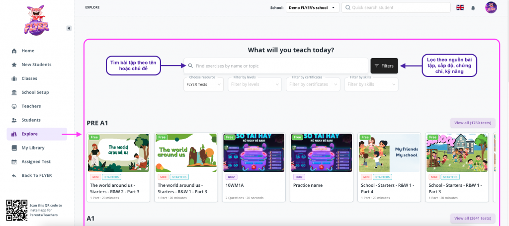 FLYER bổ sung thêm 1 giao diện thư viện đề mới, trực quan hơn, giúp giáo viên dễ dàng tìm kiếm bài tập khi giao bài cho học sinh. Tại đây liệt kê toàn bộ kho bài tập của FLYER bao gồm đề bài luyện tập ngắn (practice), mini tests và quizz: