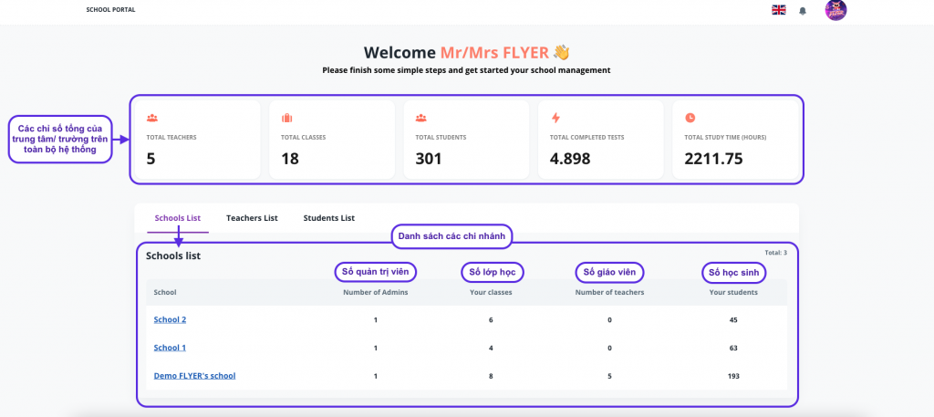 Ban quản lý của hệ thống trung tâm/ trường học giờ đây có thể xem tổng giáo viên, học sinh và chi nhánh ngay tại trang chủ, cùng với các chỉ số tổng quan của toàn hệ thống.