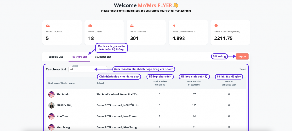 Ngoài giao diện thống kê tổng quan bên trên, FLYER cũng bổ sung thêm danh sách học sinh & giáo viên của từng chi nhánh để thuận tiện hơn cho công tác quản lý của quý đối tác.