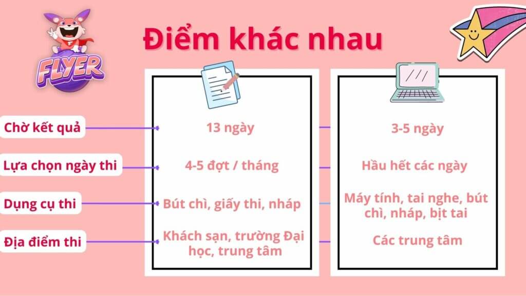 | Lựa chọn ngày thi | Ít lựa chọn hơn với 4-5 đợt thi/ tháng (Tùy vào trung tâm tổ chức) | Được tổ chức hầu hết các ngày trong tháng |