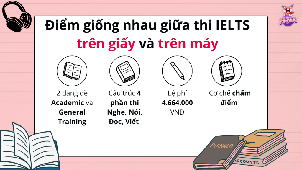 Thi IELTS trên giấy và máy tính có sự tương đồng ở những điểm quan trọng như dạng đề thi, cấu trúc đề thi, lệ phí và cơ chế chấm điểm.