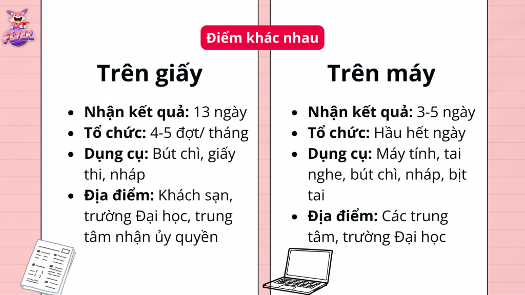| Dụng cụ thi | Bút chì, giấy thi, giấy nháp | Máy tính, tai nghe, bút chì, giấy nháp, bông bịt tai chống ồn |