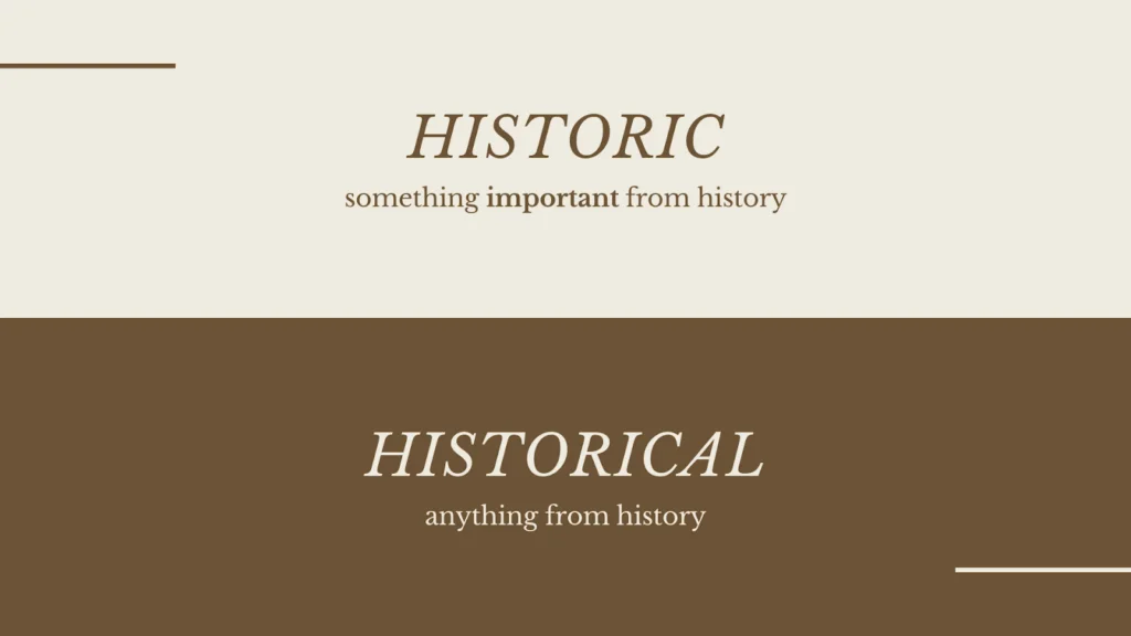 | Cách dùng | Được dùng để chỉ những sự kiện, cột mốc hoặc địa điểm có tính chất quan trọng trong lịch sử. Nói cách khác, “historic” được sử dụng để nói về những thứ nổi bật và quan trọng đối với lịch sử. | Thường được sử dụng để chỉ các sự kiện, văn bản, tài liệu, con người, tội phạm,… thuộc về quá khứ/ thế hệ trước. |