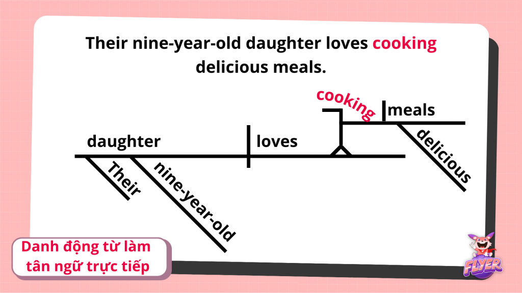Trong câu này, thầy cô cần nhấn mạnh: “cooking” không có vai trò như động từ “cook” (nấu) mà đóng vai trò như một danh từ ám chỉ việc nấu ăn và bổ nghĩa cho động từ “loves” đứng trước nó.