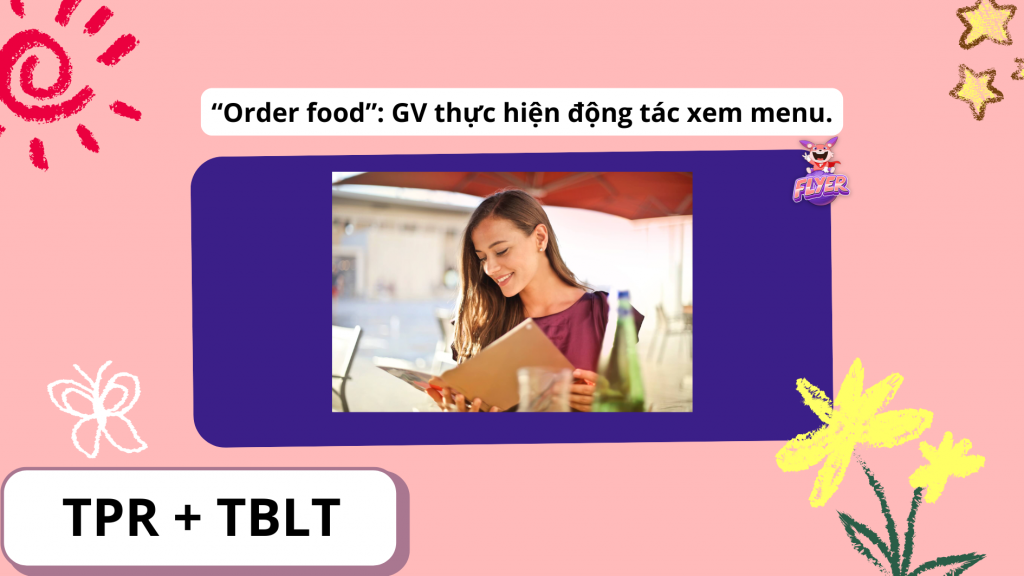 - “Order food” (Gọi món): Giáo viên nói và thực hiện động tác cầm thực đơn.