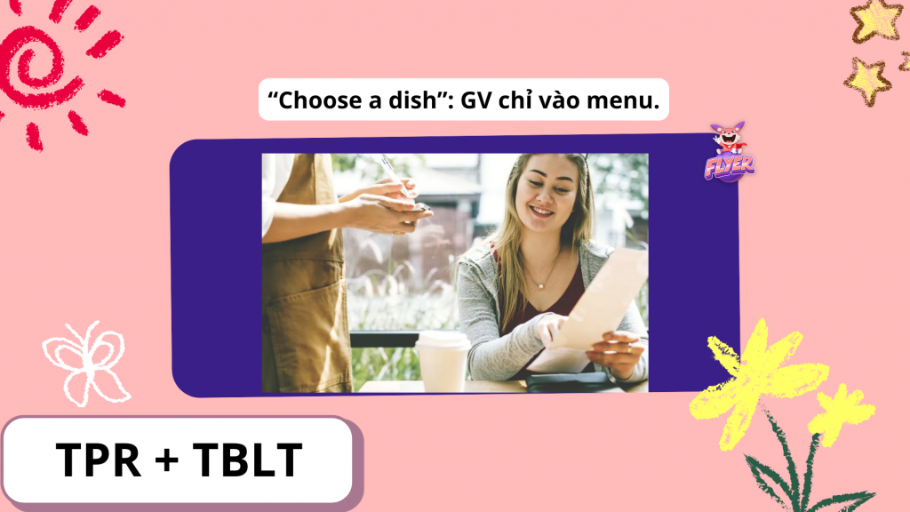 Ứng dụng TBLT: Học viên đóng vai làm khách hàng và nhân viên phục vụ. Nhiệm vụ của khách hàng là chọn món, gọi món và gọi thanh toán.