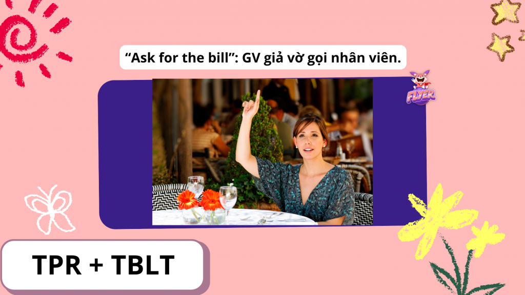 - “Ask for the bill” (Gọi thanh toán): Giáo viên giả vờ gọi nhân viên phục vụ và nói: “May I have the bill please?”