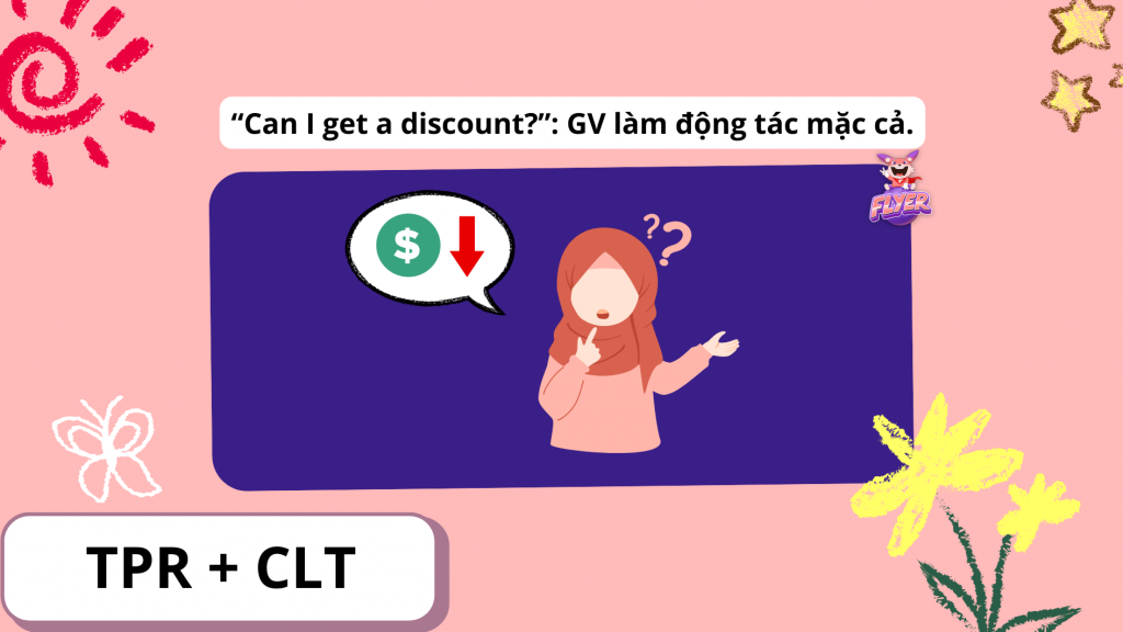 - “Can I get a discount?” (Tôi có được giảm giá không?): Giáo viên nói và làm động tác mặc cả.