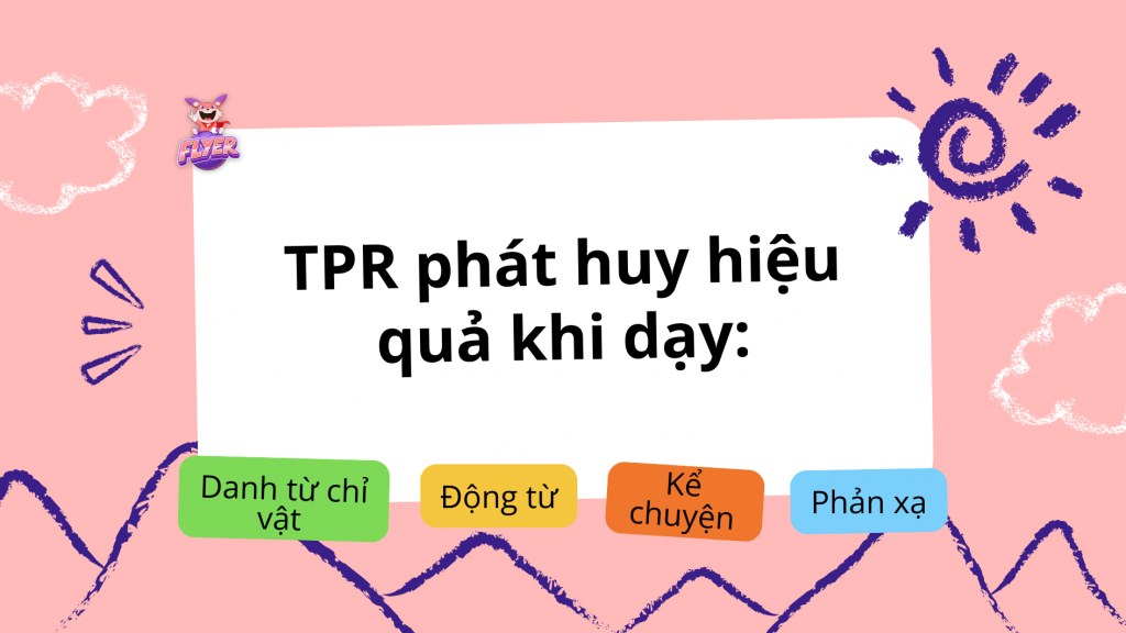 Phương pháp TPR là một cách dạy từ vựng hiệu quả đã được ứng dụng ở quá khứ, hiện tại và cả tương lai. TPR chú trọng kết hợp lời nói với hành động nhằm giải thích một khái niệm đơn giản. Việc học tiếng Anh thông qua đó trở nên thú vị và hấp dẫn hơn, đồng thời giúp học sinh hiểu và nhớ từ nhanh hơn. Tuy nhiên, phương pháp này cần chọn lọc đối tượng giảng dạy (trẻ em và người mới bắt đầu) cũng như lọc nội dung giảng dạy (từ vựng/ câu đơn giản thay vì các khái niệm trừu tượng và cấu trúc ngữ pháp phức tạp). Thầy cô cần chuẩn bị một tinh thần thoải mái, vui vẻ, tích cực để giúp lớp học trở thành một “sân chơi” thú vị nhất. FLYER chúc thầy cô thành công.