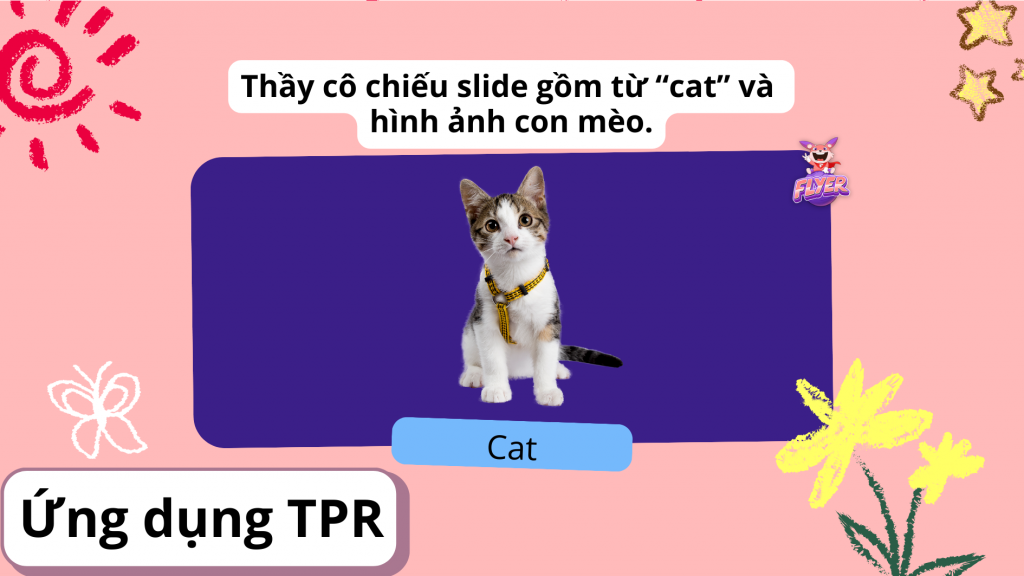 - Bước 1: Thầy cô giới thiệu về chủ đề bài học và chiếu slide hình ảnh con mèo kèm từ “cat” nhằm giúp học sinh hiểu rằng “cat” có nghĩa là “con mèo”.