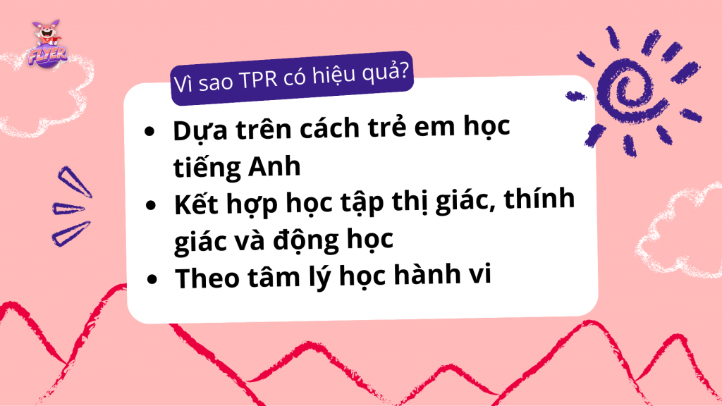 - TPR giúp hầu hết các đối tượng học sinh, đặc biệt là trẻ em và người mới bắt đầu ghi nhớ từ mới dễ dàng hơn bằng việc đưa ngôn ngữ và người học vào một bối cảnh nhất định.