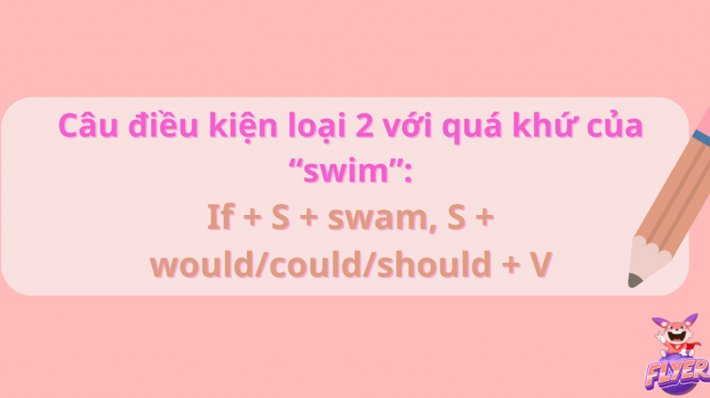 Trong cấu trúc câu điều kiện loại 2, động từ chính của mệnh đề If luôn được chia ở thì quá khứ đơn. Do đó, nếu sử dụng “swim” trong câu này, bạn có cấu trúc câu như sau: