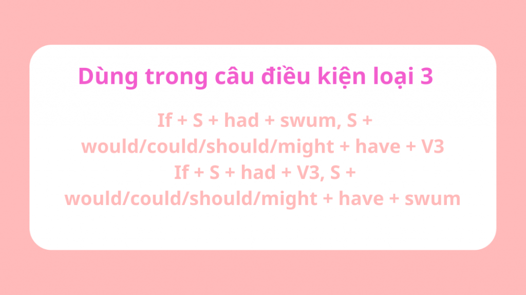 Khi ứng dụng quá khứ của “swim” vào câu điều kiện loại 3, bạn đơn giản chỉ cần thay “swum” vào động từ của mệnh đề if hoặc mệnh đề chính. Cấu trúc câu điều kiện loại 3 với “swum” như sau: