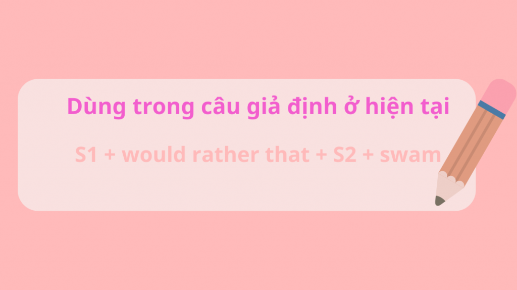 Khi muốn bày tỏ những mong muốn trái với thực tế ở hiện tại, thay vì sử dụng các cấu trúc đơn giản như “I hope” , “I wish”, bạn có thể nâng cấp câu nói của mình bằng cấu trúc giả định. Như bạn đã biết, câu giả định ở hiện tại sẽ tuân theo công thức: “S1 + would rather that + S2 + V-ed/V2”. Vì động từ trong câu sẽ được chia về dạng thêm “ed” hoặc V2, nếu dùng động từ “swim” trong câu này, bạn cần chuyển thành “swam” theo cấu trúc: