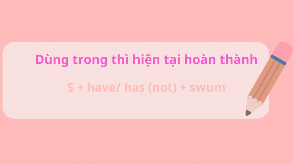 | Hiện tại hoàn thành | S + have/ has (not) + swum | She has not swum in this pool for 2 years. (Cô ấy đã không bơi trong hồ bơi này 2 năm nay.) I have swum with my dad for 2 hours. (Tôi đã bơi cùng bố 2 giờ rồi.) |