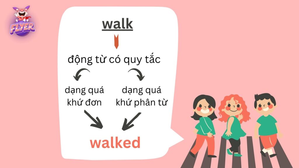 Vì “walk” là một động từ có quy tắc nên động từ dạng quá khứ của “walk” sẽ được viết là “walked”, giống nhau ở cả 2 dạng quá khứ đơn và quá khứ phân từ.