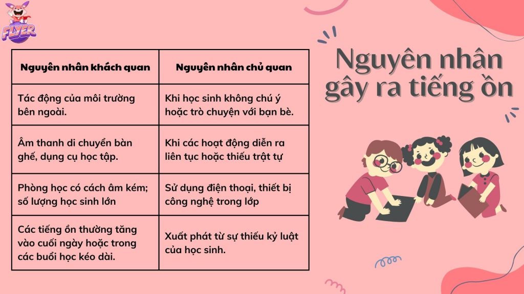 | Âm thanh phát ra khi di chuyển bàn ghế, sử dụng sách vở hoặc dụng cụ học tập. | Khi các hoạt động trong lớp diễn ra liên tục hoặc thiếu trật tự, học sinh sẽ dễ mất tập trung hơn và trở nên ồn ào. |