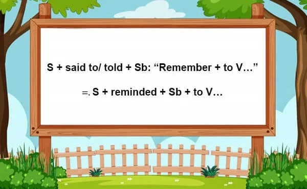 Câu trực tiếp dạng “remember + to V-inf” sẽ được biến đổi sang câu gián tiếp có dạng cấu trúc là “remind + to V-inf” như sau: