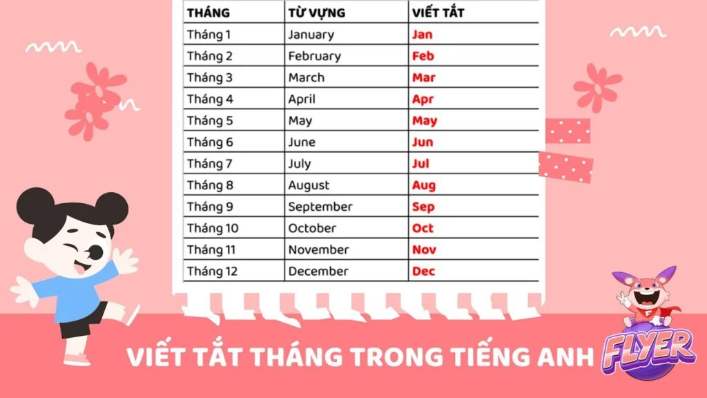 Dưới đây là bảng từ vựng và viết tắt của 12 tháng trong tiếng Anh cùng với phiên âm của nó.