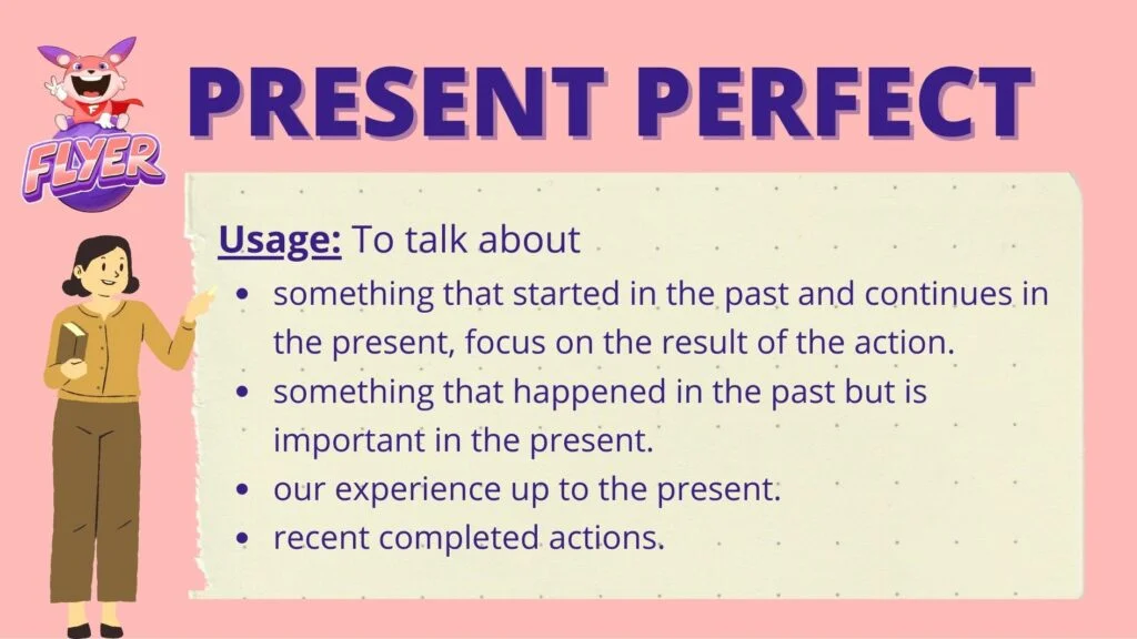 Trong phần này, FLYER sẽ đề cập chi tiết về cách sử dụng của Present Perfect để bạn có thể hiểu rõ hơn về khái niệm này. Present Perfect thường được dùng trong 5 trường hợp sau đây: