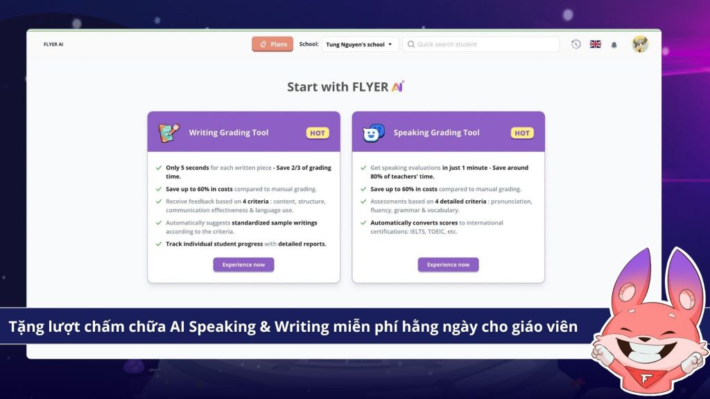 - Tặng lượt sử dụng AI hằng ngày cho giáo viên để chấm chữa bài viết (dưới dạng văn bản hoặc hình ảnh), cũng như chấm Speaking tự động.