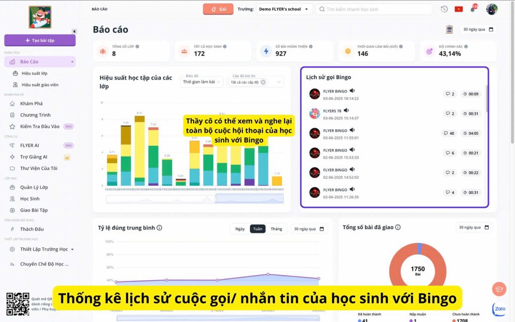 Theo dõi chi tiết lịch sử gọi điện/ nhắn tin của học sinh với FLYER Bingo AI