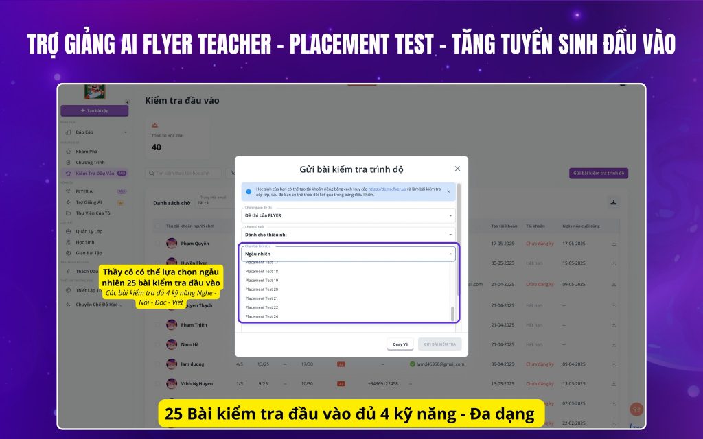 FLYER Teacher cung cấp tính năng Kiểm tra đầu vào trên phiên bản thầy cô hoàn toàn miễn phí giúp giáo viên xác định chính xác trình độ tiếng Anh của học sinh. Nhờ đó, thầy cô dễ dàng tư vấn lộ trình học phù hợp, góp phần nâng cao trải nghiệm học tập và tăng tỷ lệ chốt học viên.