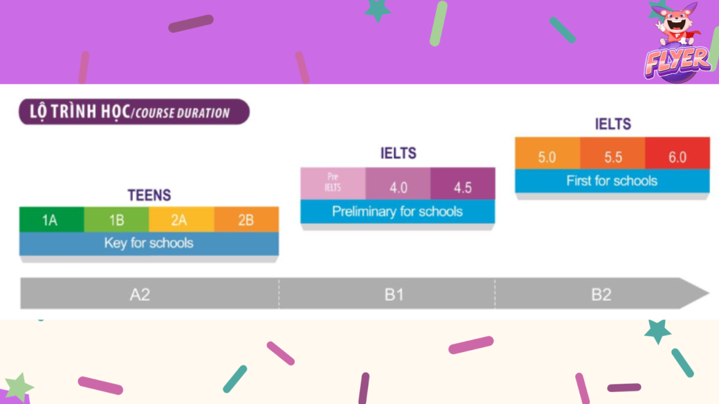 | Tiếng Anh Trung học Cơ sở | 11 – 13 tuổi | Luyện phát âm 44 âm IPA và ngữ điệu như người bản xứ Học 300 từ vựng, 16 chủ điểm cơ bản làm nền tảng cho bài thi Reading (đọc) Học 20 chủ điểm ngữ pháp thường gặp trong bài thi Writing (viết) và Speaking (nói) Luyện viết từ câu đơn đến câu phức | Làm quen với các dạng bài, phương pháp chấm điểm, cách ôn tập 4 kỹ năng trong bài thi IELTS Đào tạo nền tảng ngữ âm, từ vựng, ngữ pháp có tính ứng dụng cao trong IELTS Xây dựng các kỹ năng làm bài cụ thể |