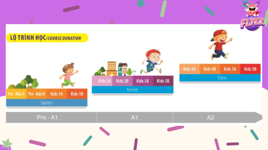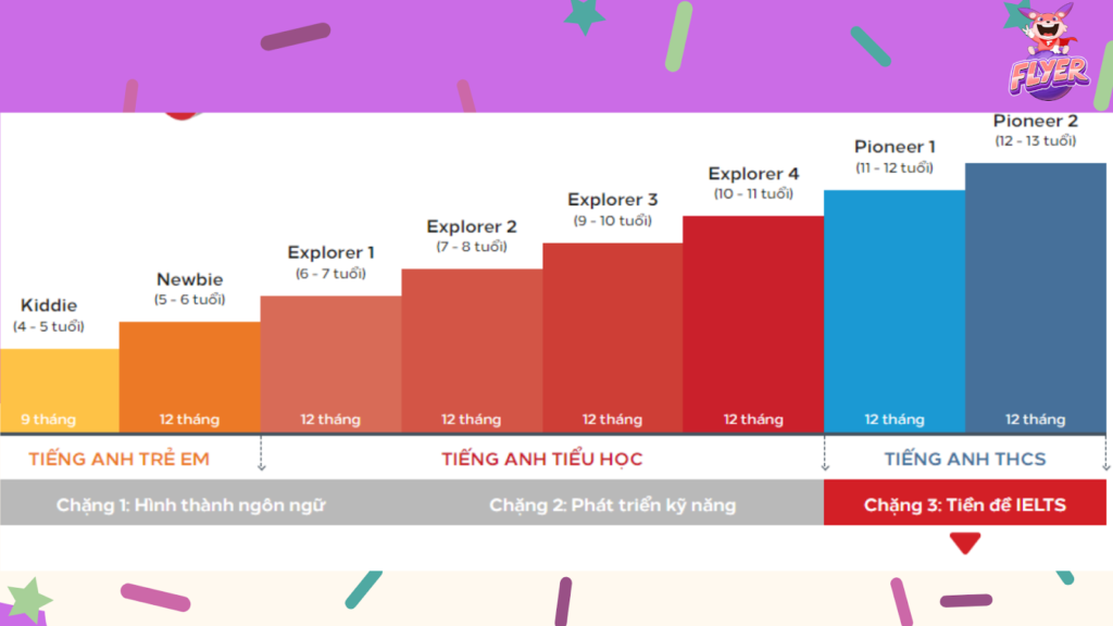 | Tiếng Anh Trẻ em | 4 – 6 tuổi | Làm quen 17 cặp âm, 3 kỹ thuật phát âm nâng cao (stress, chunking, & rhythm) Cung cấp 300 từ vựng, 16 chủ điểm cơ bản như: Personal information, leisure time and activities, families,… Làm chủ 10 chủ điểm ngữ pháp cơ bản như thì, hòa hợp thì, câu bị động,… | Làm quen với ngôn ngữ, học chữ cái, phát âm cơ bản Nhận biết các từ vựng quen thuộc Rèn luyện phản xạ ngôn ngữ Nắm vững các chiến thuật làm các dạng bài thường gặp Biết cách viết câu cơ bản, cách triển khai ý. |