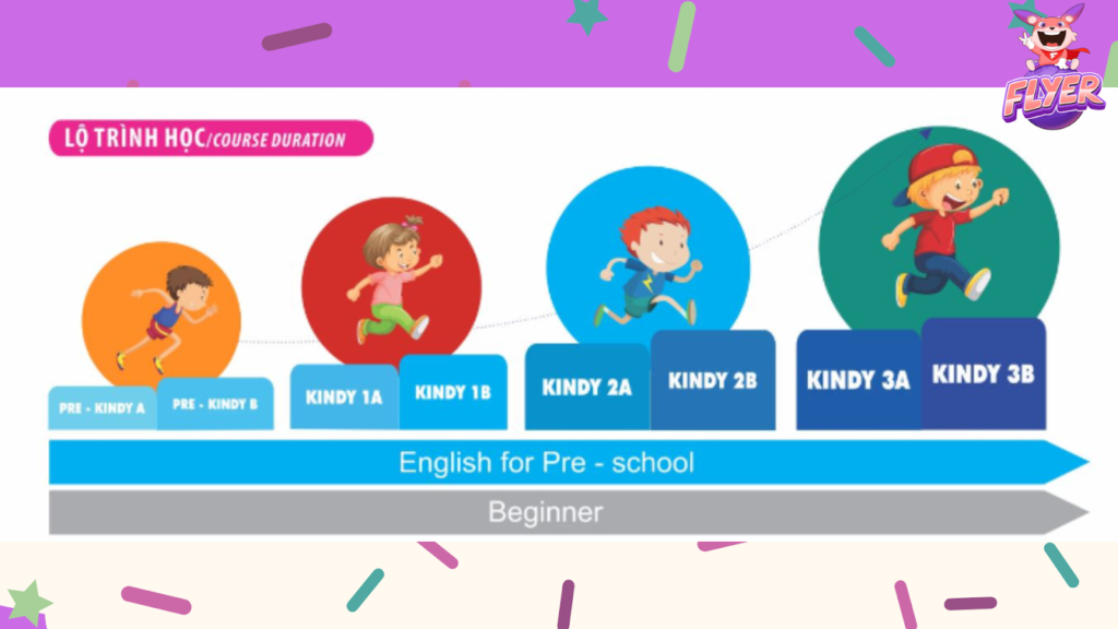 | Discovery English | 4 – 6 tuổi | Làm quen với ngôn ngữ mới Luyện phát âm chuẩn Xây dựng nền tảng ngữ pháp và từ vựng Tăng cường tư duy bằng 2 thứ tiếng Tăng cường khả năng xử lý, lưu trữ thông tin bằng tiếng Anh Tích hợp nhiều chủ điểm khác như ngôn ngữ học, toán học, khoa học, nghệ thuật,… | 48 giờ/ cấp độ học (384 giờ/ khóa) | 2.589.000 – 3.589.000 VNĐ/ 16 giờ |