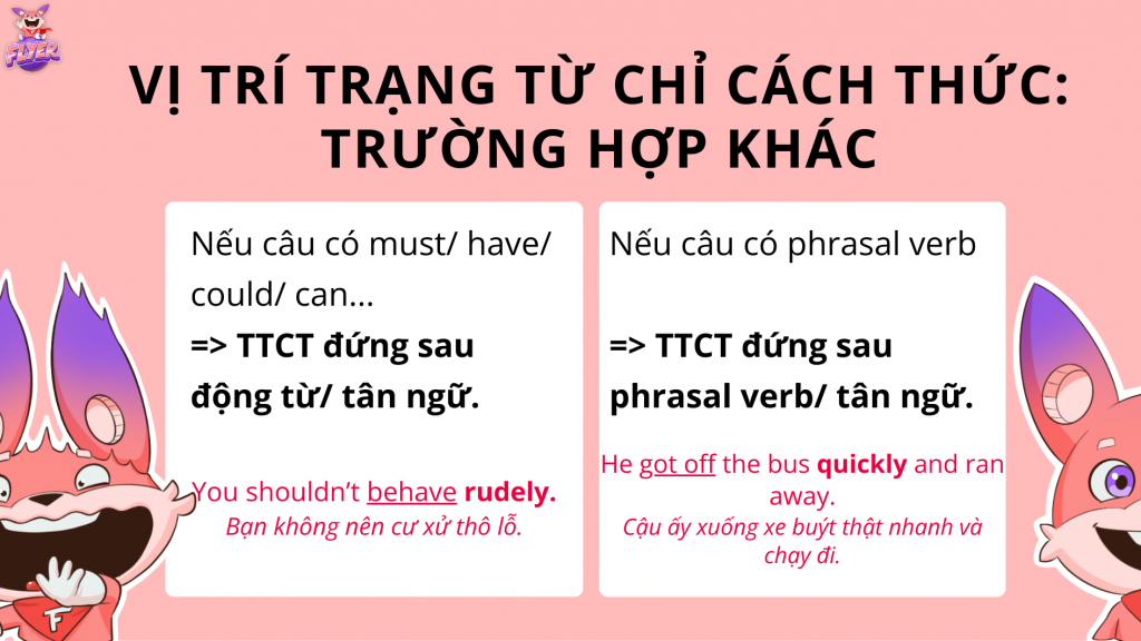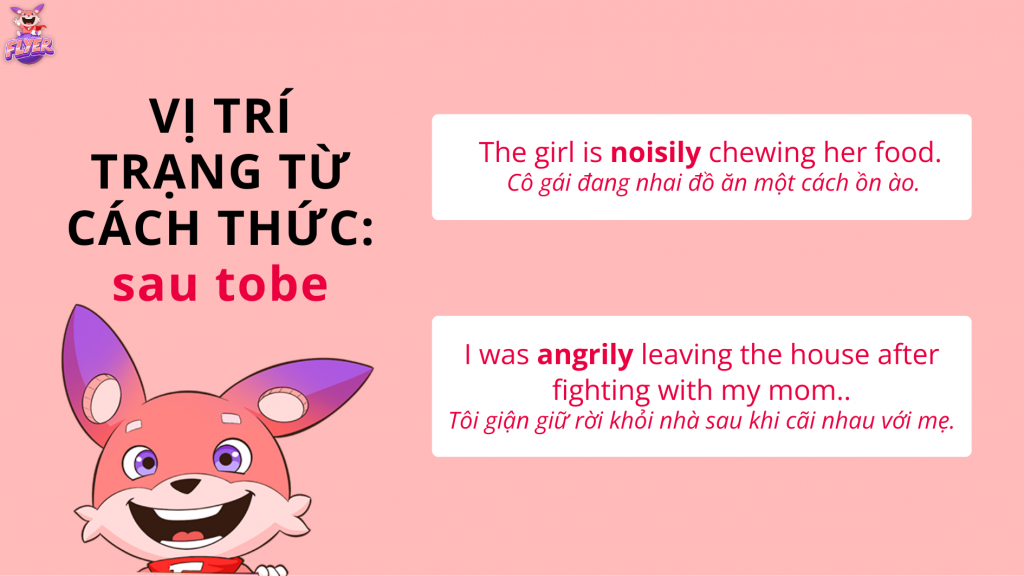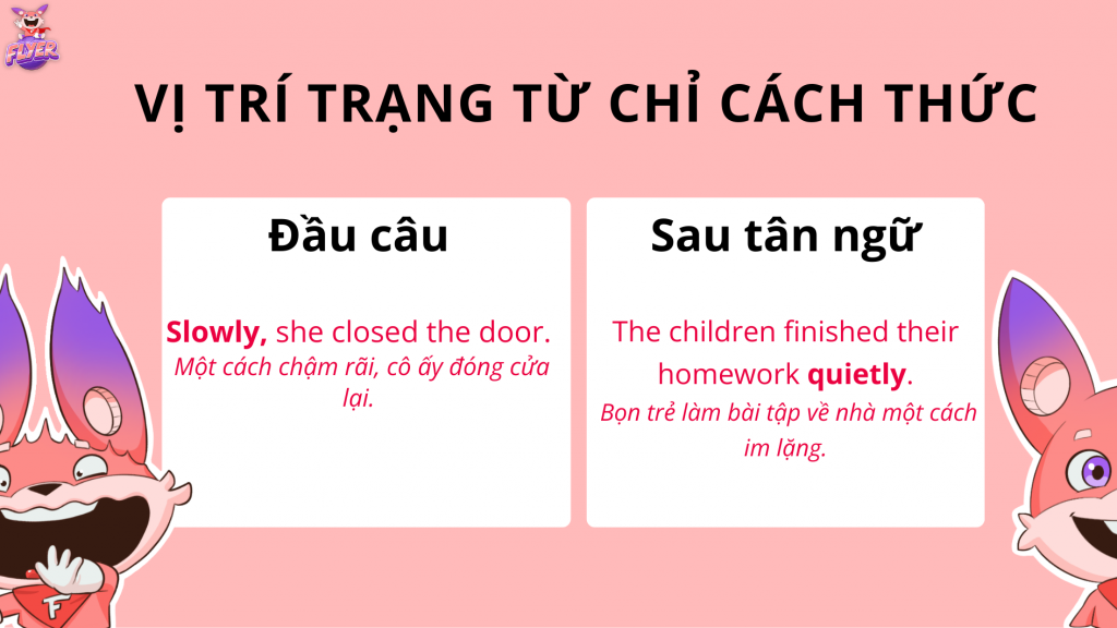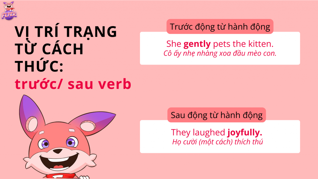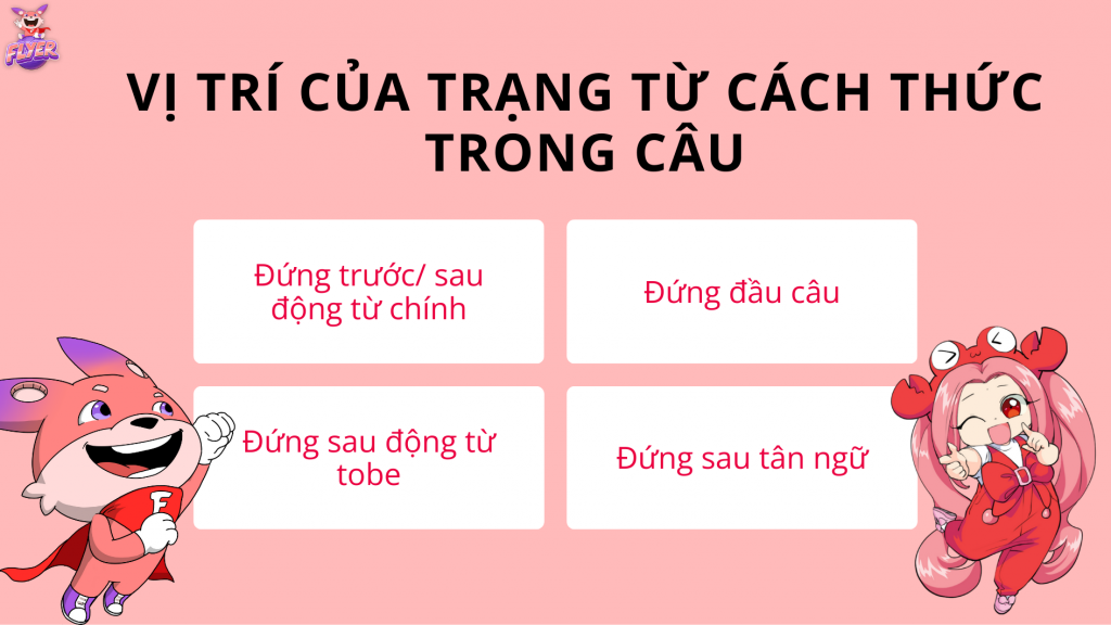 Vị trí trạng từ cách thức thường xuyên xuất hiện là đứng sau động từ chính của câu. Bạn chỉ nên thay đổi vị trí của trạng từ cách thức nếu đã nắm rõ quy luật ngữ pháp. (Xem kỹ phần 4)
