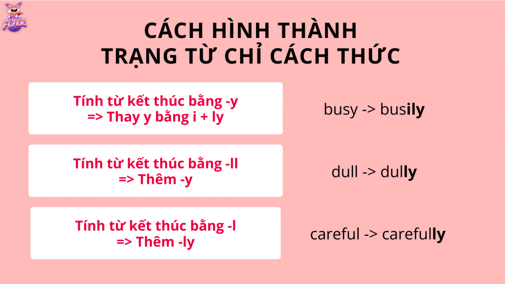 Phần lớn các trạng từ chỉ cách thức được hình thành bằng cách thêm đuôi “-ly” hoặc “-y” vào tính từ. Cụ thể các trường hợp được thể hiện trong bảng sau: