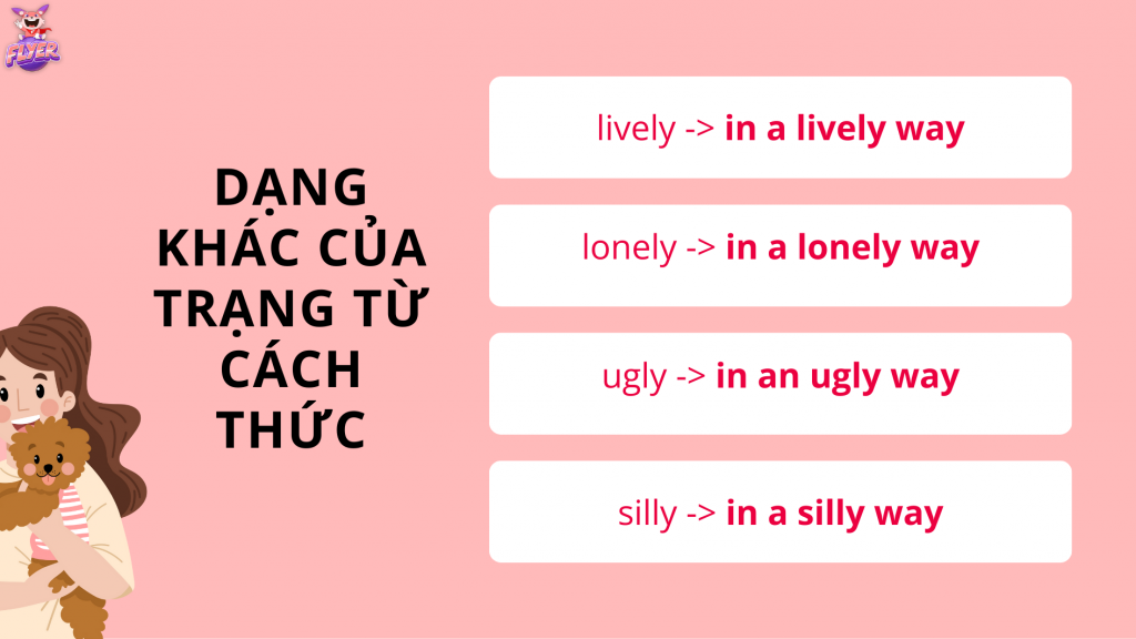 Một số tính từ kết thúc bằng “-ly” có thể có dạng trạng từ cách thức theo cấu trúc sau: