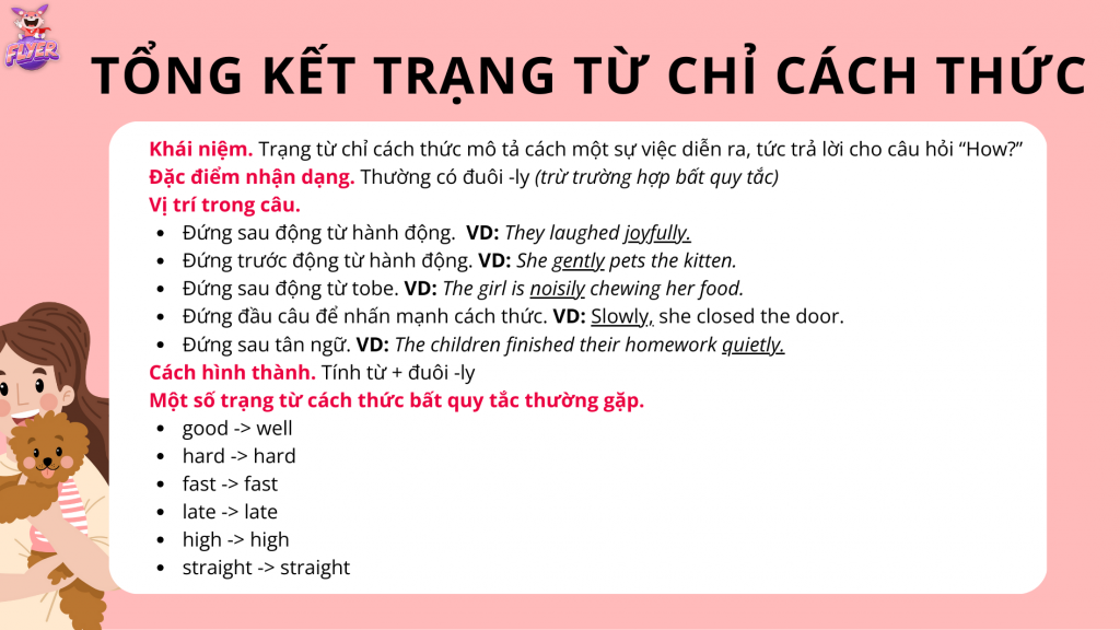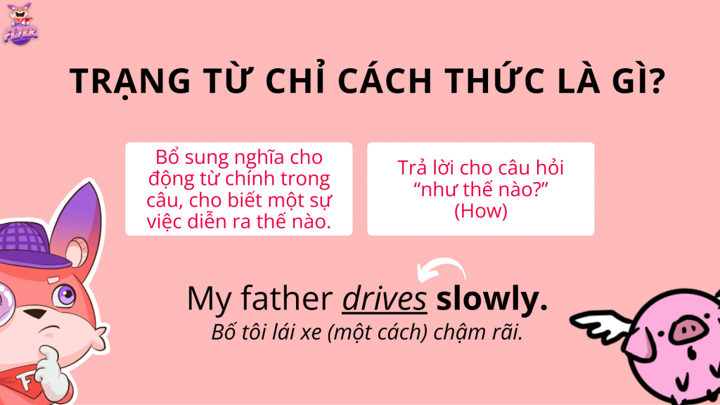 Trạng từ chỉ cách thức dùng để bổ sung nghĩa cho động từ chính trong câu. Chúng cung cấp thêm thông tin trong miêu tả, “thổi hồn” vào câu từ, khiến những gì bạn viết và nói trở nên sinh động và thú vị hơn. Nhờ đó, người đọc và người nghe cũng dễ dàng hình dung nên sự vật, sự việc.